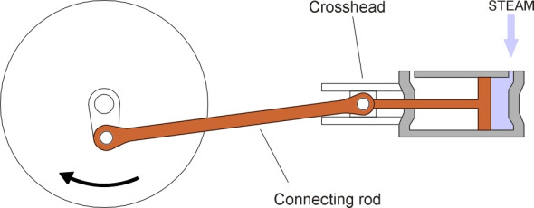 It seems that a steam locomotive needs two people to make it work and a fair degree of skill to make it work efficiently. But in one respect at least, it is a simple machine: the boiler delivers power to the wheels directly, with no clutch or gearbox for the driver to worry about. It does this through the pressure of steam acting on the pistons (figure 5), and the thrust is about the same regardless of how fast the loco is moving and even if it is standing still. So if the train has to stop for any reason it is not difficult to get it moving again, because a high tractive effort - the force that propels the vehicle along the track - is always available, and in fact it is only too easy for a steam engine driver to spin the wheels and damage the rails.
