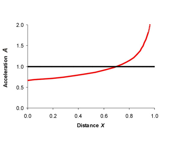 \[\begin{equation} A \quad = \quad \frac{2}{3} \left( 1 - X \right)^{ - \frac{1}{3}} \end{equation}\]For the constant acceleration case the value of the equivalent dimensionless variable is just \(a_{c}\) divided by \(a_{c}\) which is unity throughout the braking sequence. The two curves are plotted for comparison in figure 9, where we see that in the constant dissipation case the dimensionless acceleration increases rapidly towards the end of the braking sequence and in fact approaches infinity as \(x \rightarrow s\). At some point it is certain that the friction demanded between the wheels and the rail is greater than the available friction and the wheels will lock. Hence the constant dissipation model is not feasible as it stands.