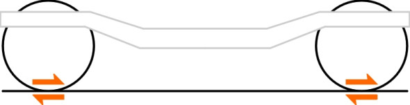 During the age of steam, all trains relied on the friction produced by cast-iron brake shoes or blocks pressing on the wheel treads to slow the vehicle down. How hard must a brake shoe press? If you think of the brake shoe pressing on one part of the tread, and the rail surface pressing on another part, you’ll see there are two friction processes going on here: one between the shoe and the tread, which slows down the wheel, and one between the wheel and the rail, which is the force that actually retards the train. Since the coefficient of friction in both cases is of a similar order, the friction force \(F\) supplied by the shoe on the tread must be around the same as the retarding force \(Q\) that is required to slow the train (figure 3), so it was necessary for each brake shoe to press on the wheel rim with a force \(N\) at least equal to the load \(P\) carried by that wheel, which for a steam loco was around 11 tons [22]. The shoe was located ahead of the wheel below the axle centreline, attached to a hanger suspended almost vertically from a pivot on the vehicle frame. It was connected to a piston and cylinder powered by steam pressure, air pressure, or a vacuum. For vehicles with steam-powered brakes or air-brakes, there would be a separate piston and cylinder attached to each brake hanger, or a single piston and cylinder operating the two hangers attached to each wheelset. Many UK steam locomotives used a vacuum system, and because the vacuum cylinder was relatively bulky the brakes for all the axles on the locomotive were powered by a single cylinder and piston, the shoes being connected to the piston via cross-beams and longitudinal pull-rods [23] as shown in figure 4. The geometry of the rodding was arranged to amplify the force generated by piston using the principle of the lever, and multiple linkages were used to equalise the forces on each wheel: a good illustration of one particular layout can be found in [24].