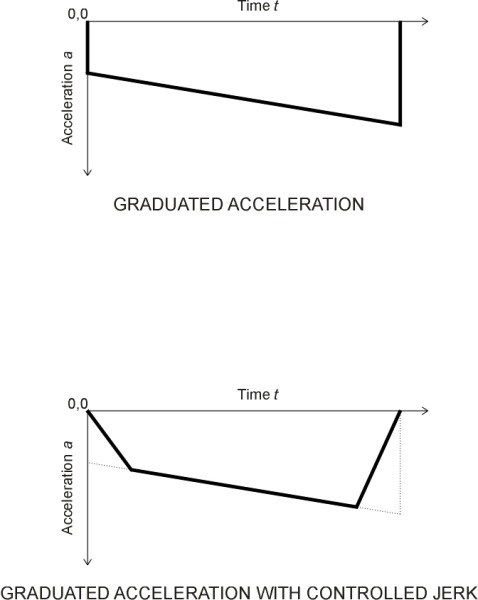 The constant acceleration model is often used in text books as a basis for understanding what is required from a braking system and how it performs. In the case of an emergency stop, this is not unreasonable. If you want to halt a train in the shortest possible distance, then the limiting factor is the friction between wheel and the rail. Assuming that the brakes are sufficiently powerful to use all the available grip, and the coefficient of friction is constant throughout the braking process, then a constant (negative) acceleration is the most effective strategy. In practice, however, the friction is not constant, but falls appreciably at high speeds, so in order to avoid locking the wheels and damaging the tread and rail surface, the braking effort must start at a somewhat lower level and build up to a maximum later on as shown in the upper part of figure 10.