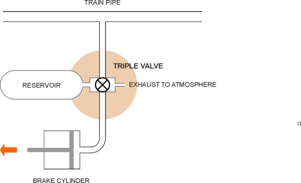 The air brake first evolved as a ‘simple system’ for steam trains. The power source was a pump driven by steam from the locomotive boiler. The pump filled a reservoir with compressed air. When the driver moved the brake lever, a valve released the compressed air to be distributed along the train pipe to the brake cylinders, one for each vehicle in the train. The working pressure was around 100 lb/in2 (700 kPa), compared with the theoretical maximum of 14.7 lb/in2 (100 kPa) for a vacuum brake. The piston in each brake cylinder in turn activated the brake shoes by a system of levers in a manner similar to that used in the vacuum system. Like the earliest version of the vacuum system, the simple air brake suffered from the disadvantage that if any of the vehicles became separated the whole system lost power and the brakes were useless. It was also slow to act, because the compressed air took an appreciable time to reach the last vehicle in the train.