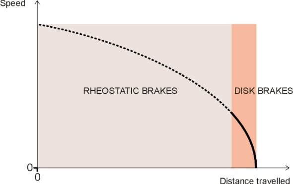 And as we have seen, for an ordinary service braking scenario, there are other factors to be taken into account, in particular, passenger comfort and energy dissipation. To avoid disturbing passengers with a ‘spike’ in the jerk level, rather than starting with a sudden application of braking effort, we want to build up to the required intensity over a finite time period. Similarly, we want the brakes to be released gradually to avoid a spike just as the train comes to a halt (an experienced car driver will do this instinctively, although a gradual release is harder to achieve than a gradual application). The designer of a high-speed train must also decide how to manage the heat dissipation process. With any braking system, there is a limit to the rate at which heat can be removed from the braking apparatus and conveyed to the surrounding atmosphere, and the intensity of braking must be regulated so that surface temperatures and the rate of heat flow lie within the range that the materials can handle. With the constant acceleration model, the rate of heat dissipation is not constant over time: as shown in Appendix 2, it peaks at the beginning of the braking sequence and falls linearly until the train stops. The uneven heat load can cause serious problems for disk pads, and consequently, high-speed trains usually have two separate braking systems. Initially, a rheostatic brake carries most of the burden, dissipating heat from the roof-mounted resistors, and because of the reduced wheel grip the rate of deceleration is comparatively modest. The disk brakes take over when the speed has fallen to a comparatively low level (figure 11). They are both controlled by a microprocessor that continually assesses the braking distance required given the vehicle’s location and speed, and works out a sequence in which the two types of brake are brought into action [10]. The result is that the overall braking distance \(s\) is no longer proportional to the square of the initial speed and in fact increases more rapidly than \(u^2\). Travelling at 350 km/h, a high-speed train today will need several kilometres to stop.