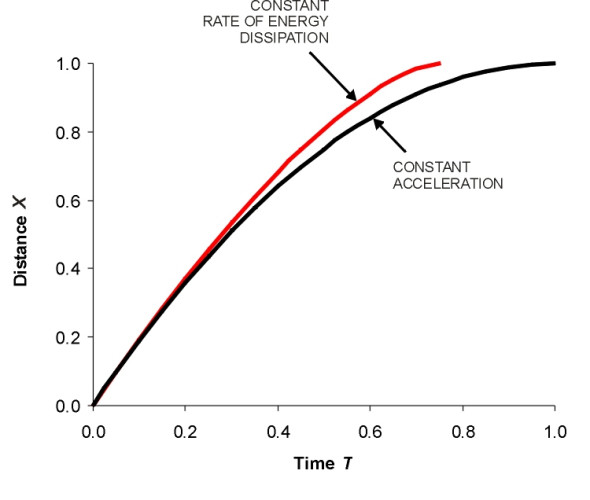 \[\begin{equation} X \quad = \quad 1 \; - \; \left( 1 - \frac{4}{3} T \right)^{\frac{3}{2}} \quad \quad \quad \left( T \le \frac{3}{4} \right) \end{equation}\]Algebraically, this expression looks nothing like the corresponding one for constant acceleration in equation 20. The shapes of the two curves are compared in figure 7, from which it is clear that in the constant dissipation case, the train comes to a halt sooner.