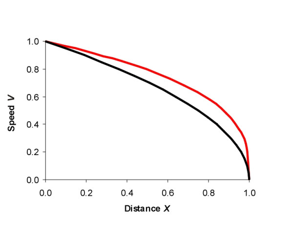 \[\begin{equation} V \quad = \quad \left( 1 - X \right)^{\frac{1}{3}} \end{equation}\]This compares with the speed profile for constant acceleration specified in equation 27. The two are plotted together in figure 8, which shows how in the constant dissipation case the train is going faster at each point along the track before it comes to abrupt halt. Just how abrupt is the halt becomes clearer if we compare the acceleration profiles. In the first model of course, the acceleration is constant. To get the profile for the second model we differentiate both sides of equation 29 thus: