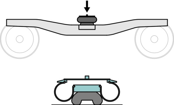 To summarise, the rail presents a rough surface that forces the wheel to deflect up and down and from side to side, tracing out irregular motions across a wide frequency range. We can now examine what happens to the vibrations as they pass upwards into the vehicle through the suspension cascade. To begin with, just as in the case of a pneumatic tyre (see Section C1114), the contact patch, which is about 10 mm across, bridges across roughness in the rail surface (figure 4). The bridging process has been described as a contact filter that effectively smoothes over the shortest wavelengths so that they are removed from the input spectrum. Also, the wheels themselves are slightly flexible: the metal deforms elastically like a very stiff spring and absorbs a small degree of roughness. Unlike that of a conventional spring, the stiffness of the ‘contact spring’ isn’t constant but rather increases with increasing deflection. Figure 2 shows the contact filter and the contact spring together as the first ‘layer’ in the suspension system. At the next level, it shows a third mechanism through which high-frequency vibrational input can be reduced, by separating the tread from the main body of the wheel disk with a resilient layer as described in Section R1610. This device is often used on trams.