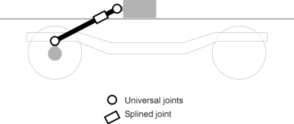 Now let’s look at a higher level. For a passenger vehicle having both primary and secondary suspension, almost the whole of the bogie contributes to unsprung mass at the level of the secondary springs. Although this has less effect on ride quality than unsprung mass further down the cascade, it is not ideal from the point of view of track wear, particularly in the case of a power bogie that is weighed down by one or more electric motors. It is good practice to move the motors as far as possible up the cascade, and on today’s high speed trains each motor is usually suspended from the vehicle body and linked to the wheelset through a Cardan shaft (figure 14).