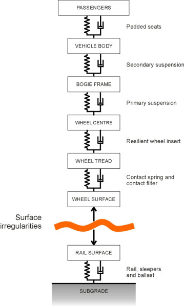 One can think of a vehicle suspension system as a black box that receives a signal, the input, and transforms it into another signal, the output. The input is the motion of the wheel rim, which is jolted up and down as it passes over bumps and hollows in the track surface, and the output is the movement of the vehicle body. The input is not a single frequency but many frequencies superimposed: they range from low frequencies associated with bumps in the rail alignment several metres long, to very high frequencies associated with tiny imperfections in the running surface and the wheel tread. The suspension is designed to operate on each of the input frequencies and absorb or filter them out so that the amplitude of the output body vibration stays within acceptable limits.