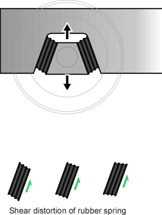 Other methods are used today. One is a modification of the horn: the axle-box is attached to a collar that slides up and down on a pair of cylindrical stubs bolted rigidly to the bogie frame as shown in figure 7. Another is the rubber shear block, built from alternate leaves of rubber and steel. There are several variants of this idea, for example, the cylindrical form as used on the TGV Y2-30 bogie [19], and, in combination with steel coil springs, on the Shinkansen series 300 bogie, while chevron rubber blocks appear on the Swedish X-2000 [25] as shown in figure 8. As well as vertical movement, a rubber shear block provides some lateral flexibility which can improve the quality of the ride. The third alternative is a coil spring with the axle constrained by one or more connecting links to the bogie frame. A simple trailing arm is shown in figure 9. This is widely used on suburban and intercity passenger trains, in conjunction with a hydraulic damper similar in principle to the dampers found on lorries and cars. Finally, it should be noted that each system provides for motion in the vertical direction but also a much smaller freedom of movement fore-and-aft so the wheelset can steer round curves. This additional freedom can be provided through a flexible axlebox mounting.