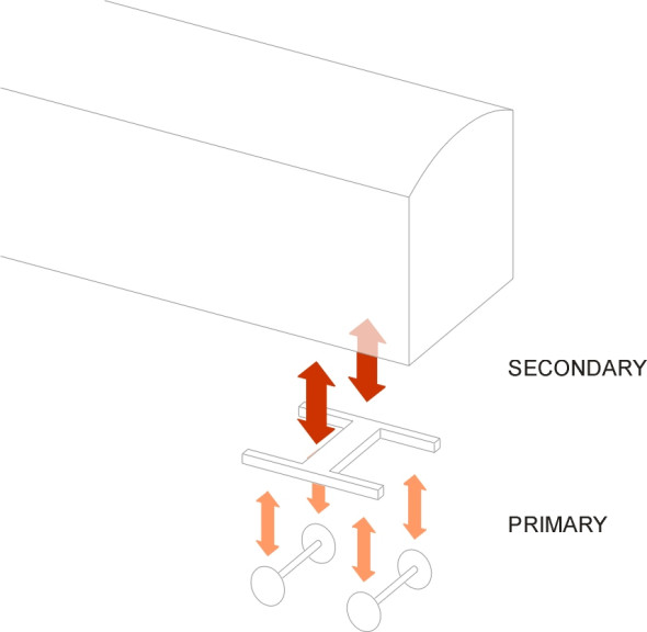 On almost all passenger coaches and some freight wagons today, the bogie carries the weight of the vehicle body through an additional set of springs and dampers known as the secondary suspension that forms the final stage in the suspension cascade (or the penultimate stage if you count the passenger seats as part of the suspension). The secondary suspension provides both vertical and lateral flexibility, so the bogie can move from side to side relative to the vehicle body in response to a lateral kink in the rail alignment and thereby reduce the impact on passengers and cargo. Secondary springs handle disturbances in the lower frequency range, and the softer the springs, the better. Their natural frequency is about 1 Hz, about the same as an automobile. But there are two practical constraints. Firstly, a railway train consists of several connected vehicles, and the floor heights of any two neighbouring vehicles must remain broadly consistent regardless of any disturbances [28]. Secondly, the design of a railway track allows for only a small clearance around the vehicle body and a large deflection can allow the vehicle body to sweep out a larger cross-section that would otherwise be the case, fouling trackside furniture and tunnel walls (see Section R1604).