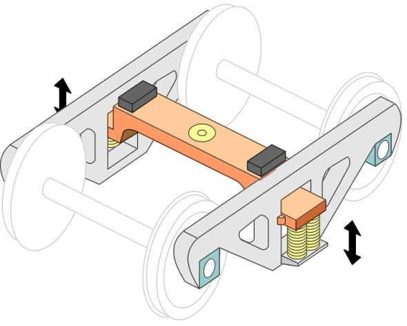 Damping takes place through a friction wedge mechanism. On either side of the bogie, the crosspiece engages with two wedges that are forced against the side frame, and the friction between the two provides resistance to vertical deflection and therefore damps the motion. Since the contact force increases with the weight of the vehicle body and its contents, effectively the damping - like the stiffness of the springs - increases with the load.