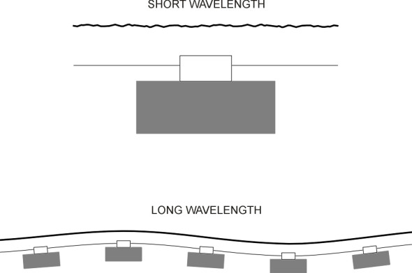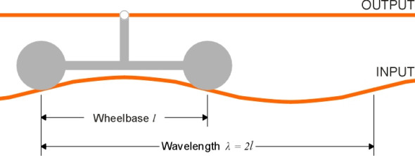 If a bogie of wheelbase \(l\) travels along a track whose vertical profile follows a regular sine wave of wavelength \(\lambda\) and amplitude \(a\), then if \(\lambda = l\) the two axles move up and down together (they are in phase) and the centre of the bogie traces out the same wave pattern, oscillating with amplitude \(a\). As far as the passengers are concerned, the output equals the input and the bogie does nothing to relieve the discomfort. On the other hand, if \(\lambda = 2 l\) the deflections of the two wheelsets are in opposite phase and effectively cancel one another out (figure 13). The passengers would not notice the bumps in the track. For irregularities at other wavelengths the bogie moderates the input to some intermediate degree. You might like to work out a formula for the amplitude of the oscillation of the bogie centre for any\(\,\) input wavelength, and plot the result.