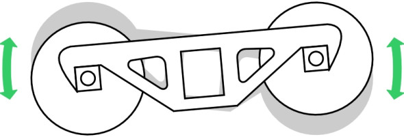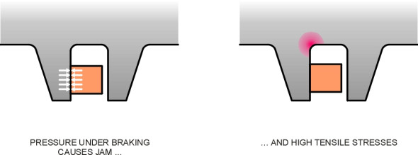 Now we come to the primary suspension proper. It usually involves steel springs together with some form of damping located between the wheelset and the bogie frame. The aim is to allow the wheelset to move up and down relative to the frame, and one of the simplest ways of doing this is to house each bearing in an axle-box that is free to slide up and down between two vertical guides - traditionally known as horns (figure 5). On older vehicles the springs are steel leaf springs, made up in layers that slide over one another when they flex, which provides a degree of damping. This is the system inherited from early steam locomotives. But it is not ideal because the axle-box presses hard against the horn under braking (figure 6). This has three consequences: first, the pressure increases the rate of wear of the sliding surfaces, secondly, the axle-box tends to jam under pressure so the springs can’t do their job, and thirdly, it creates tensile stresses at the base of the horn that can lead to cracking under repeated loads.