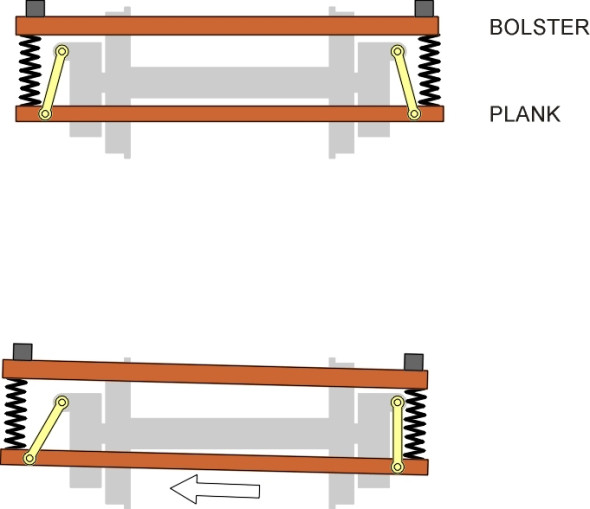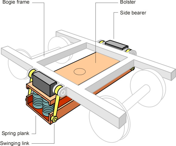 We’ll begin with passenger bogies, which are more complex than the bogies used for freight wagons. The first is the swinging link bogie. It is constructed to allow the coach body to swing from side to side so it is insulated from lateral impacts delivered to the bogie by kinks in the track. The whole of the secondary suspension is seated on a plank that is slung laterally across and underneath the bogie frame as shown schematically in figure 18. The plank hangs from four links so the body settles naturally in a central position on a straight track but is free to deflect sideways on a curve [20]. Fore and aft movement is constrained by traction rods (not shown in the Figure). The swinging links are inclined at an angle to the vertical so that any sideways deflection has the effect of tilting the plank slightly, which helps to counteract any tendency for the body to roll outward under centripetal force (figure 19). Together with the plank and the bolster across the top, they act geometrically like a four-bar linkage (the linkage shown in figure 17 above is a different four-bar configuration known as the Watt’s linkage: both are related to the Ackermann steering linkage commonly found on road vehicles as detailed in Section C0504). Over several decades the swinging link suspension arrangement has been used for passenger coaches, many of which are still in service. However, it embodies a relatively large number of moving parts which together raise the overall weight of the bogie, and which require regular lubrication.