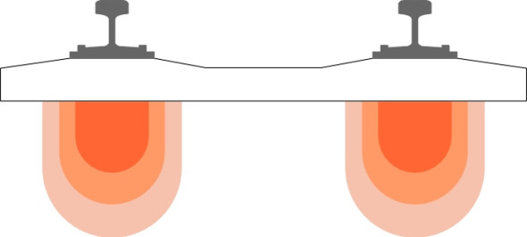 This is the technique used with roads and railways, although the method used to spread the load is different in either case. On a railway, each wheel is supported by a steel rail that is sufficiently rigid to spread the load over a length of a metre or so, transmitting it to a group of sleepers laid crosswise that spread the load further. If the wheel were positioned directly over a sleeper, about 40% of the load would pass directly into that sleeper, with just under a quarter going to each of its immediate neighbours [15], and the remainder to sleepers further away (figure 4). In turn, the sleepers are bedded on a layer of crushed stone called ballast\(\;\) that spreads the load further still across a width of around 2.7 m [24]. A conventional track, then, consists of three essential ingredients [1]: the rail, the sleepers, and the ballast (figure 5). Together they diffuse the wheel load so that the compressive pressure, which starts at a little under 1 GPa between the wheel and rail, is reduced in stages to a value around 40 kPa at the subgrade [4] [13], a reduction factor of roughly 8000 (figure 6).