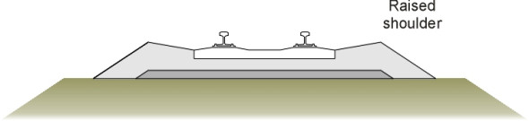 A track can resist sideways movement on a curve if the ballast is piled up to provide generous shoulders [1], with the depth increasing to around 0.5 m beyond the sleeper ends as shown in figure 10. Generous shoulders also reduce the risk of a straight track buckling in hot weather. But with the development of high-speed railways, other problems have emerged for which no-one has yet found a solution. High-speed trains leave an aerodynamic wake that can pluck individual chippings out of the surface layer. Once airborne, they can damage the underside of the vehicle, and occasionally a particle lands on the rail head where it is crushed by a passing wheel and scores the running surface. Mysteriously, on a high-speed track, the ballast that is laid on curved sections tends to migrate from the high end of each sleeper and pile up against the face of the inner rail. The cause is not known for certain, but one imagines that the energy injected into the structure when a train passes at speed will from time to time loosen granules at the surface, which under repeated track loading will roll down the slope until trapped by the rail.