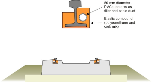 A slab can be made from three different types of material (reinforced concrete, pre-stressed concrete, and asphalt), and there are several ways of fixing the rails. A comprehensive account of the various alternatives can be found in [6]. The most popular approach is to construct the slab first then lay the sleepers on top of the slab on a rubber mat. A variation of this method is used in the Channel Tunnel, where each sleeper is split into two short segments. Each segment is insulated with a rubber pad set in a rigid plastic boot and embedded in the slab. Several alternatives have been pioneered in Germany, and in one of the early variants, the slab is shaped like a trough with a 180 mm thick reinforced concrete base. Sleepers are placed in the trough, which is then filled with concrete to secure them in place. Alternatively, the sleepers are wired in position and the whole concrete slab cast around them. In Japan, the slab is prefabricated in short sections only 160 mm thick and pre-stressed so they can be laid very quickly on a 400 mm thick vibration-absorbing asphalt roadbed. Cylindrical plugs cast into the roadbed prevent the slabs from sliding out of position. But the most interesting development is one in which there are no sleepers at all: the rails are embedded in slots cast into the slab, separated from the concrete by an insulating layer of epoxy compound that holds them in position and absorbs some of the vibration that would otherwise lead to a rough and noisy ride (figure 12).