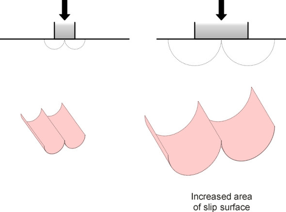 There are two ways to get round this. The first applies to tall buildings. You can work out beforehand the weight of a skyscraper and dig a deep foundation so the weight of soil removed is roughly equal to the weight of the structure that replaces it. The pressure of the foundations resting on the soil will then be equal to the pressure previously exerted by the excavated material, so that as far as the ground underneath is concerned, nothing has changed. There is no ‘extra’ load to carry, and the building floats like a ship in deep water. The alternative is to accept that there will be an increase in the load carried by the soil, but to spread the increase over the widest possible area (figure 3). The soil can still fail by rotation, but the geometry forces a large body of soil to rotate. Since the larger body has a larger surface area along the plane of failure and the resistance is proportional to this surface area, it will carry a greater load.
