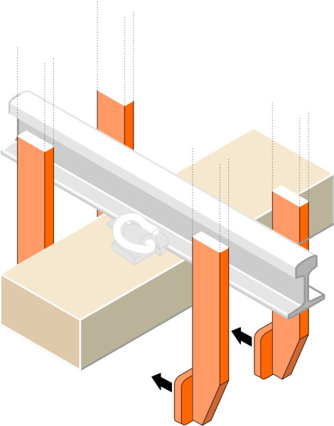 The word ‘sleeper’ dates from the 18th century and is used only in the UK. The American term is ‘tie’, the French ‘la traverse’, both of which express the fact that the beam holds the rails a fixed distance apart. In German it is ‘die Schwelle’. Thousands of sleepers, laid at equal intervals along the track, form an intermediate layer between the rails and the supporting ballast below. Many sleepers continue to be made from timber, for example beech, oak, or tropical azobé, impregnated with preservative under pressure. Typically 2600 mm long by 250 mm wide and 150 mm deep, a timber sleeper will last for between 25 and 50 years [17]. Because it is relatively flexible, a timber sleeper will distribute loads more evenly than a concrete sleeper but it can’t be used for high-speed operation because of its low weight: it can be displaced sideways by the wheels of a heavy locomotive at speed.