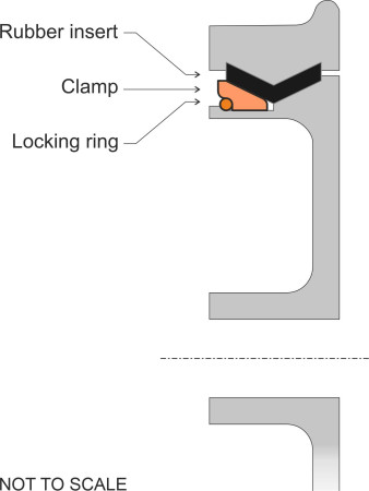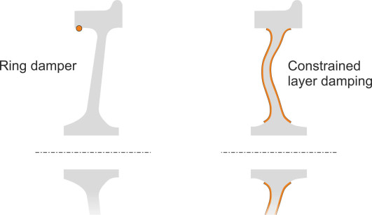 The noise emitted from a railway train can be reduced either by modifying the wheels or by fitting energy-absorbing devices to them. A summary can be found in [28], and we’ll pick out only a three examples here. A device commonly used on urban trams is a resilient wheel made up of three components: an inner disk and an outer steel tyre separated by a rubber or plastic insert that isolates or partially isolates the tyre from the hub. The insert is V-shaped in cross-section and fixed in place by a clamping disc and locking ring; the principle is shown in figure 12. An alternative approach is to fit damping devices to conventional (solid) wheels. Damping devices fall broadly into two classes: (a) those that absorb energy across a continuous range of frequencies, and (b) tuned absorbers. Examples of the first kind are shown in figure 13. The ring damper clips into the wheel rim and rubs against the disk surface when it vibrates, which dissipates some of the energy. The constrained layer damper is a sheet of visco-elastic material that presses against the wheel disk and resists vibrational motion, dissipating the energy internally in the form of heat. It is held in place by a metal sheath. By contrast, a tuned absorber makes use of the phenomenon we noted earlier, that a rigid disk vibrates preferentially in certain modes each having a characteristic resonant frequency, and the device consists of a set of blades each tuned to one of the resonant modes. Several absorbers are needed for each wheel, bolted to the inside of the rim or the outer extremity of the web. If the blades are fixed parallel to the web, the absorber can damp axial modes and hence reduce curve squeal. If the blades are arranged parallel to the running surface they can damp radial modes.