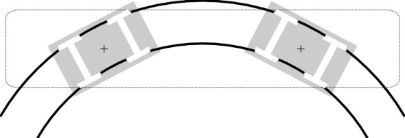 \[\begin{equation} r_{inner} \quad = \quad r \; - \; \gamma y \end{equation}\]So if the wheelset deviates to one side, the outer wheel travels further during each revolution, which forces the wheelset to yaw back in the opposite direction. In other words, a displaced wheelset automatically compensates by returning towards a central position on the track, and in fact under ideal conditions it will steer round curves without either of the flanges touching the rails at all (figure 6).