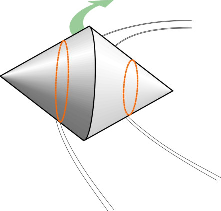 The distinctive profile of a railway wheel with a flange on the inner face is not exactly new; it dates back at least to the seventeenth century when flanged wheels made of wood were used in the mining industry, guiding the trucks that carried coal and metal ores away from the pit-face. While modern rail wheels appear to have a similar shape, the flange is much smaller, projecting only 30 mm from the tread, and the geometry has evolved so that for most of the time, the flange doesn’t actually touch the rail. Instead, the wheel is guided by the tread alone, which has a shallow taper not obvious the naked eye. In many countries, the taper is standardised at 1:40, so that the tread surface forms part of a long, narrow cone (figure 4). The conicity of a wheel tread is defined as the tangent of the half-angle \(\gamma\) subtended at the apex of the cone (figure 5). Since \(\gamma\) is small, to a close approximation the tangent is equal to the angle itself expressed in radians. The cone-shaped tread means that the effective radius of a railway wheel is not fixed, but depends on the lateral position of the wheelset relative to the track centreline. This feature, combined with the solid axle, gives the vehicle an almost magical ability to steer itself around curves in the track.