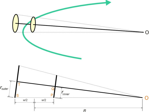 \[\begin{equation} \frac{r_{outer}}{R + \frac{w}{2}} \quad = \quad \frac{r_{inner}}{R - \frac{w}{2}} \end{equation}\]and if we substitute for \(r_{inner}\) and \(r_{outer}\) via equation 1 and equation 2 this becomes