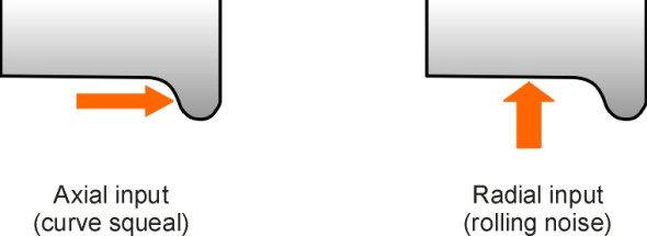 The different modes are excited by different kinds of interaction between the wheel and the rail. When the train goes round a sharp curve, it is the lateral reaction from the outer rail pressing on the wheel flange that generates axial input (figure 11). The wheel vibrates in one or more axial modes and the result is an unpleasant squeal. On the other hand, when the wheel rolls along a straight track the input is provided in a vertical direction from roughness in the track surface, which excites coupled radial and axial modes with one nodal circle, typically at 2 kHz [27].