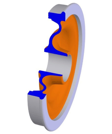One can think of a railway wheel as a solid disk whose tread is machined into the desired profile. In practice, some wheels have a separate ‘tyre’. The tyre, usually about 60 mm thick when new, is made of hardened steel. It is heated and pressed onto the wheel disk, where it shrinks as it cools and tightens its grip so that no bolts are needed to hold it in place. Ideally, for a smooth ride the diameter of the wheel should be as large as possible (see Section G1209), and in fact, the driving wheels on some early steam locomotives were 9 feet (over 2.7 metres) in diameter. They were magnificent examples of craftsmanship, and they needed to be large because they were driven by connecting rods, pistons and valve gear that were liable to fail if worked too fast, and a large wheel compensated by carrying the loco further along the track for each piston stroke. Later, when these limitations were overcome, the driving wheels were scaled down to a more manageable size. Nowadays, they are made of pressed steel, and for many the cross-section is wavy rather than flat (figure 2). A wavy cross-section provides resilience and allows the rim to expand and contract slightly with changes in temperature without putting the disk under too much stress; useful properties for tread-braked wheels and those with separate tyres. Rubber inserts make the wheel more resilient still, helping to reduce any impact on the suspension when it passes over a gap in the rail.