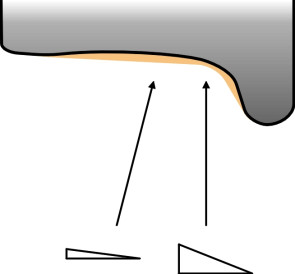 Unfortunately, after it has left the factory a conical wheelset doesn’t remain conical for very long, because in service, the tread is worn to a concave profile (figure 8). This changes the geometry. As we’ll see later in Section R0415, the equivalent conicity is much larger than the nominal value, and hence a railway vehicle with moderately worn wheels will steer round curves of smaller radius than the same vehicle with new wheels. On the other hand, when the wear reaches a critical level, among other things the wheelset becomes more likely to jump the rails (Section R0314). Hence, a wheelset must be re-profiled at frequent intervals, although its life can be prolonged by machining to a curved profile (we’ll return to this and related matters in Section R0415).