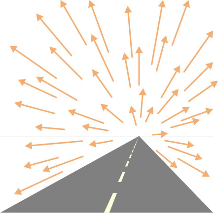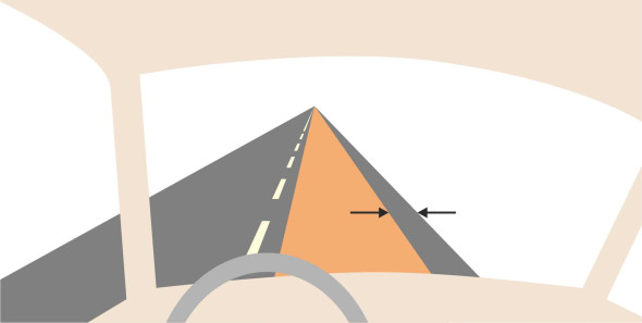 Other important cues are visual ones: motion changes the way we see our surroundings. Imagine you are sitting in the front seat of a car travelling along a straight road, looking forward through the windscreen. Different parts of the landscape seem to be moving in different directions, expanding radially from a point directly ahead (figure 2). When you look to the right or left, nearby features such as trees and fences appear to move past more quickly than distant ones. The closer the object, the more dramatic the impression of speed. The impact of the visual cues varies not only with the speed of the vehicle, but with the nature of the landscape. For example, on a narrow country lane, if there are trees and hedges close to the roadside, they will appear to be rushing past, and will reinforce the driver’s awareness of speed. Similarly on a narrow urban street. But on a wide road, the verges and hedgerows are further from the driver’s line of vision, and have less impact. As a result, one might expect drivers to feel less inhibited, and therefore drive faster.