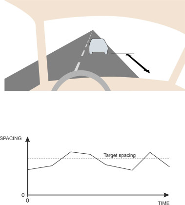 We’ll begin with one of the most basic tasks in the first group, which is to control the lateral position of the vehicle on the highway. Imagine you are driving along a two-way rural road in a country where people drive on the right. There are no sharp bends, only shallow curves and the occasional straight section. If at any moment your car seems too close to the kerb, you turn the handwheel a little to the left (figure 1). If it’s too close to the carriageway centreline, you turn a little to the right. The adjustments might be described a tracking process. It involves a feedback loop, in which your position, like the temperature in a thermostatically controlled hot water system, zigzags between acceptable limits on either side of the ‘target’ position. In this way, you can travel for long distances without consciously thinking about the road layout, and the steering controls of a modern car allow you to keep your vehicle within a few centimetres of your target.