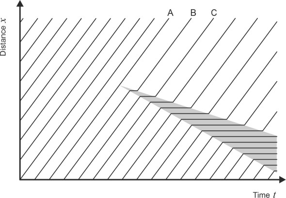 However, this is a hypothetical scenario. In reality, the vehicle lengths, speeds, and spacing vary from one vehicle to the next, and small fluctuations in the speed of an individual vehicle can make the flow unstable. More than fifty years ago, researchers investigated rear-end collisions on motorways that were growing in frequency as traffic levels increased over time. Let us return briefly to the ‘safe spacing’ scenario in which vehicle B is following vehicle A along a single traffic lane, and imagine that instead of coming to a halt, vehicle A slows down for a while and then resumes its original speed. As shown in figure 5, vehicle B is a little too close behind, and must brake harder than vehicle A to restore a safe time gap. Behind vehicle B, a third vehicle C is also travelling a little too closely to the vehicle in front, and the driver has to brake harder still. If all the spacings between the vehicles upstream are too small, eventually one of them must come to a halt, and from that point on, a queue builds up, with vehicles continually arriving at the rear, working their way through the queue, and leaving at the front, so that the queue moves rearwards along the carriageway as it grows in size. Figure 6 is a simplified representation of what happens on a large physical scale. Each vehicle is shown as arriving at speed \(V\), stopping abruptly for a while, and then leaving the queue at the same speed. In reality, there should be curves between the straight-line segments to reflect the periods of braking and acceleration.