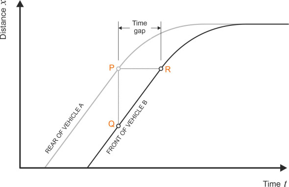 ‘Tail-gating’ is a common phenomenon on high-speed roads. Imagine that vehicle A is being followed closely by vehicle B. They are mechanically similar and their minimum stopping distances are equal. We want to know the minimum time gap that will enable driver B to avoid a collision if the lead vehicle suddenly brakes to a halt. One can represent the motion of a vehicle through its trajectory, a line on a graph showing how its position along the road varies over time. Distance is usually measured along the vertical axis, and time along the horizontal axis, so that the slope of the line at any point equals its velocity. The solid grey line in figure 3 shows the trajectory of vehicle A – specifically the rearmost point of the vehicle body, while the black line shows the trajectory of vehicle B, in this case, the nose rather than the tail. The problem arises when the rear of vehicle A reaches point P, where the driver suddenly applies the brakes and carries out an emergency stop. Driver B does not react straight away, so the trailing vehicle continues for a short while at constant speed: the last possible moment for the driver to start braking is when the front of vehicle B also reaches P. Hence, the time gap must be sufficient for driver B to perceive what is happening and hit the brake pedal. Any less, and there will be a collision. Therefore in principle, the minimum safe time gap is equal to the driver’s response time, typically a little under 2 seconds.