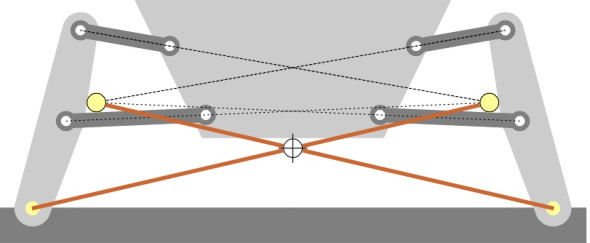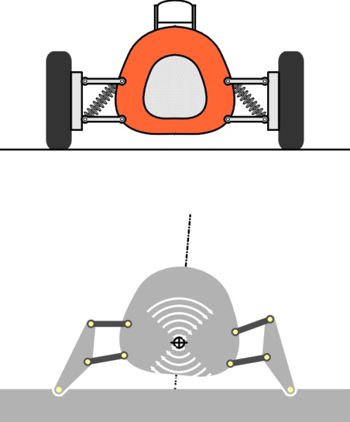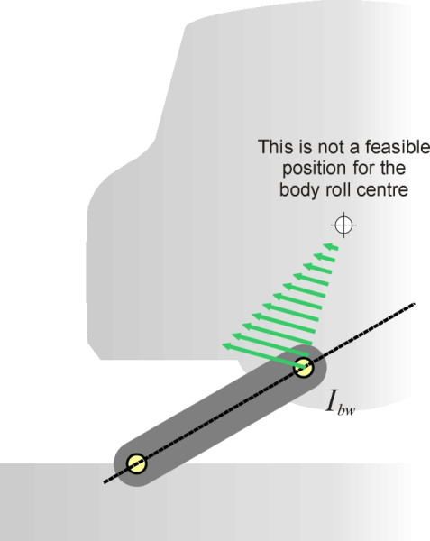 So why does a vehicle roll? An obvious answer is that the springs are elastic, and centripetal force acting on the vehicle makes it rotate, squashing the outside springs and stretching the inner ones relative to their normal positions. In this Section we will see that the degree of roll depends not just on the spring stiffness but on the geometry of the linkages, and in particular, it is the geometry that determines the instantaneous centre around which the body rotates.
