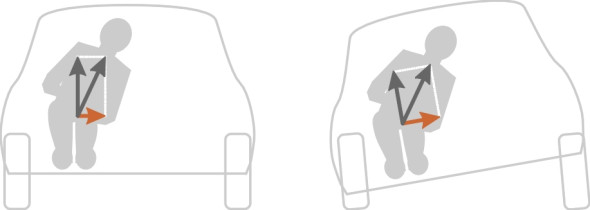 Let’s start with the angle of roll. If you think of the roll centre as an imaginary hinge between the sprung mass (car body) and unsprung masses (wheels and suspension), then other things being equal, the lower the roll centre, the greater the leverage exerted by the body mass owing to centrifugal force (figure 13). Hence a low roll centre means a greater roll angle. Too much roll is undesirable, because it is uncomfortable for passengers, and because with independent suspension, the wheels lean in the same direction as the body, and if the body leans outwards, the wheels do too (figure 14). It’s important to keep the wheels upright as far as possible, otherwise they are liable to lose grip (see Section C1717). In summary, a high roll centre is desirable both for passenger comfort and for roadholding (and in the unlikely event that the roll centre were above the centre of mass, the body would hang like a pendulum and the car would lean inward on curves, like a tilting train). Body roll is also critical for trucks, but for a different reason: when a truck is heavily loaded its centre of mass rises, and at a high roll angle it can move significantly away from its normal position, threatening to turn the vehicle over.