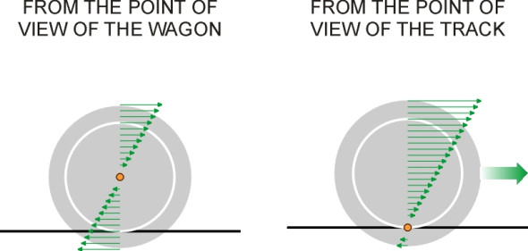 In fact, the body isn’t the only part of the car that rotates. The body is really just one link in a chain of suspension links, and each link ‘rolls’ about its own centre of rotation. Each of these centres is defined in exactly the same way as the body roll centre, but to distinguish them from the body roll centre we’ll just call them Instantaneous Centres (ICs). We can find the body roll centre by locating the ICs of the suspension links one by one, starting from the ground and working upwards along the chain until we reach the body itself. But we have to be careful because the IC of any given object depends on one’s point of view. Picture, for example, a railway wagon rolling along a track. If you are riding aboard the wagon, every part of the wheel seems to be moving except its centre, so the axle centreline is the IC from your point of view. If you are standing by the railway track, the axle is moving so the IC must be somewhere else. It lies at the centre of the contact patch, this being the only part of the wheel not in motion from your point of view (figure 4).