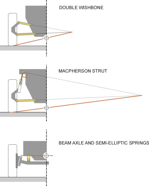 figure 11 shows the body roll centre (a) for the double wishbone suspension with corresponding roll centres for (b) the MacPherson strut suspension and (c) the rigid beam axle with semi-elliptic springs for comparison. Notice that the roll centre for the the rigid beam axle is quite high up, level with the spring attachment points. For the MacPherson strut it is lower down. In the case of the double wishbone layout, the roll centre can be positioned at almost any height we wish, by altering the angles and lengths of the wishbones.