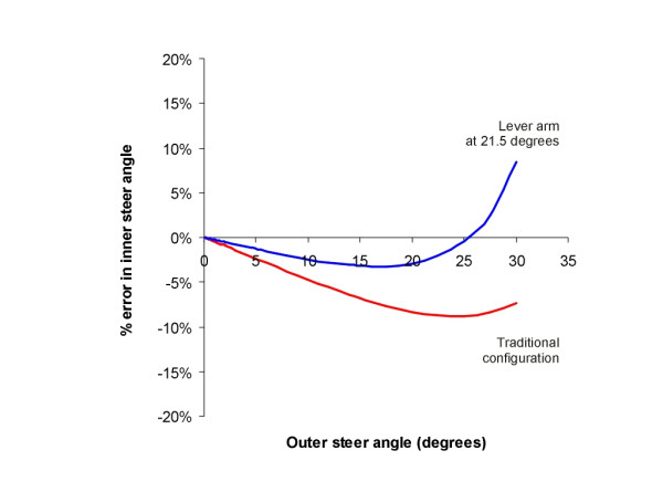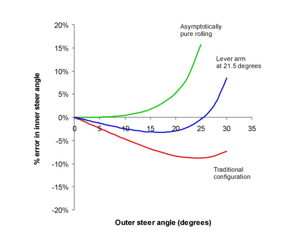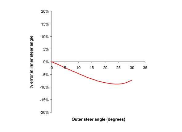 In principle, this configuration can be analysed in the same way as the traditional four-bar linkage, although the geometry is more complicated and the author has not been able to derive a formula for the inner steering angle \(\delta_{i}\) explicitly in terms of the outer steering angle \(\delta_{o}\). Again we can express the inner steering angle as a power series expansion of the outer steering angle and compare the coefficients with those required for pure rolling. The values of the coefficients \(\delta_{i}'(0)\) and \(\delta_{i}''(0)\) are derived in Appendix 3, equation 65 and equation 66. They are: