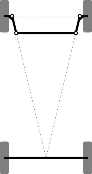 If the purpose of the Ackermann steering linkage is to minimise scrub at small steering angles, the theoretically optimum layout requires the point of intersection of the lever arms to be located close to the centre of the vehicle wheelbase. This is further forward than the traditional layout for early cars, and as the technology progressed some manufacturers did indeed move the intersection point forward to a location roughly two thirds of the wheelbase from the front axle [2]. Since then, the situation has changed completely, because the modern trend is to go the other way [1]. With the four-bar linkage, this means fixing the point of intersection of the steering arms aft of the rear axle. This has the advantage that the inside wheel then swivels through a smaller angle at full lock, which in turn reduces size of the wheel housing where it intrudes into the passenger cabin. But a more important reason is that the car handles better. At high speeds, the assumptions underlying the ‘pure rolling’ analysis no longer apply, because the wheels don’t move in the direction they are pointing. The tyre slip angles (see Section C1717) become significant, and since load is transferred from the inside to the outside wheel on any curve, the inside and outside slip angles will be different. In order to maximise grip, suspension designers aim for a higher slip angle on the outside tyre, which means a reduced degree of Ackermann compensation.