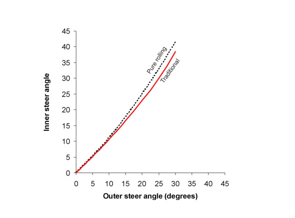 In fact, with the exception of the dead-ahead position, there may be no steering angles at all that produce pure rolling. We can demonstrate this for a car with wheel base 5.0 m, track width 2.5 m, and u = 250 mm. The traditional layout demands that the projections of the two lever arms intersect at the rear axle, so we have
