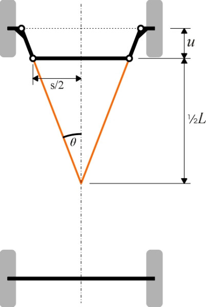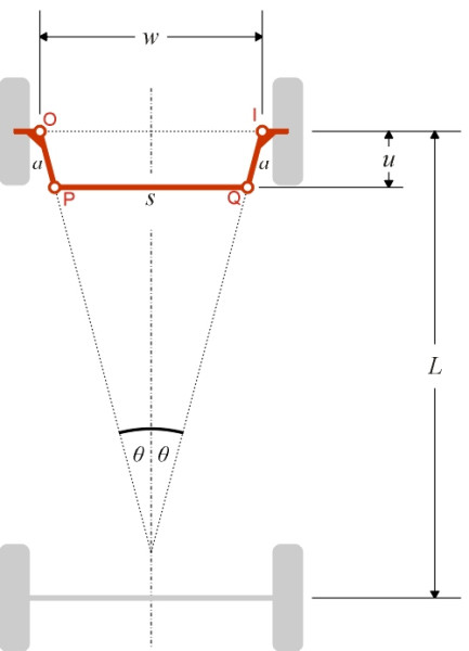 As explained earlier (Section C0505), for many decades it was the custom to arrange the steering arms so that their projections intersect at the rear axle (figure 4). Why? The intention was to minimise tyre scrub, in other words, to make each front wheel roll in the direction it is pointing without any sideways scrubbing of the contact patch. The layout shown in figure 4 became common practice - a rule of thumb that was easy to remember and easy to set up on the drawing board. But it was only an approximation, because for any given set of values of \(L\), \(w\), \(u\) and \(\theta\), it turns out that the 4-bar linkage is capable of producing ‘pure’ rolling only at isolated steering positions. We cannot have zero scrub across the whole range. In what follows we will try to work out the arrangement that comes closest to what was intended.