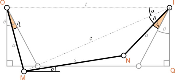 \[\begin{equation} - a\cos (\theta - \delta_{o}) \; - \; s \sigma' \sin \sigma \; + \; a \delta_{i}' \cos (\theta + \delta_{i}) \quad = \quad 0 \end{equation}\]We can eliminate \(\sigma'\) from equation 42 and equation 43 and after some rearrangement we get