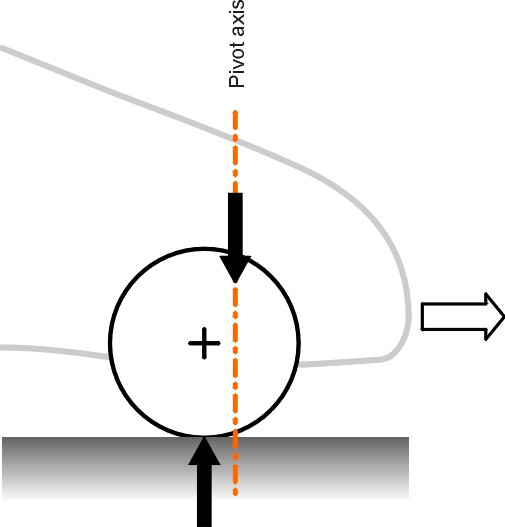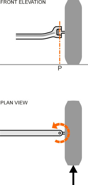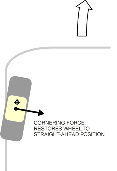 Let’s begin with castor. The aim is to have the wheel trail behind its pivot axis like a castor on a supermarket trolley (figure 2). It is possible to run a car with zero trail or even a small negative trail with the wheel ahead of the pivot axis. But this arrangement fails to meet the first requirement of any steering system, that if the driver lets go of the handwheel, the steering should return automatically to the central position rather than causing the vehicle to swerve unpredictably to one side. In fact, if the wheel is too far ahead, any deviation from the straight ahead position tends to increase of its own accord, and like the castor of a supermarket trolley, the wheel will try to flip round 180\(^{\circ}\) and tear itself off the car. By contrast, with positive trail the car is directionally stable even if the driver releases the handwheel. It does this because any steering movement will generate a cornering force on the tyre contact patch that in turn restores the steering towards its central position (figure 3).
