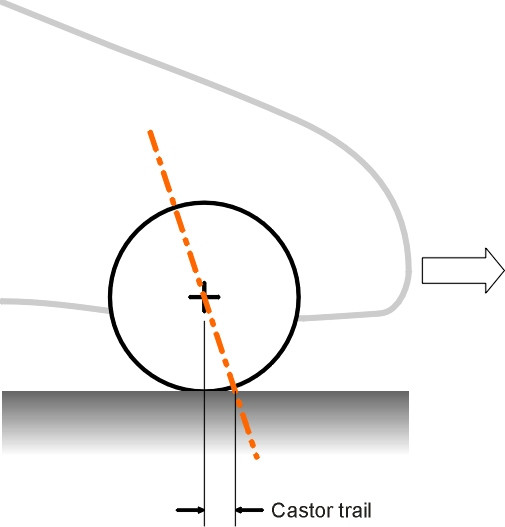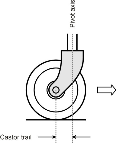 On a supermarket trolley, the pivot axis is vertical, so the two main forces on the suspension - the weight of the body pressing down from above, and the reaction from the road surface pressing up on the wheel from below - are not aligned (figure 4). Together they exert a couple on the suspension, and if this configuration were used on a truck with a beam axle, for example, they would twist the axle on its mountings. The solution is to rake the pivot axis astern like the mast of a sailing ship, at an angle of several degrees from the vertical so it passes down through the wheel bearing to meet the road surface a short distance ahead of the centre of contact of the tyre with the road (figure 5). This castor angle, as it is usually called, provides mechanical trail without putting an eccentric load on the suspension.