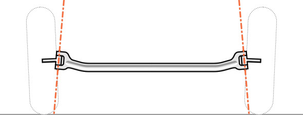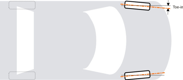 As if all this were not enough, when the front wheels of a car are set in the ‘straight ahead’ position, the wheels don’t actually point fore and aft (figure 15). Usually for a rear-wheel drive model, they are adjusted with a small toe-in (typically less than one degree). The reason is that when the suspension is configured with a positive offset, the front wheels encounter rolling resistance, which drags them backwards relative to the car body: they swivel outwards, which tends to wear out the tyres. For rear-wheel drive cars, toe-in is a cheap and simple way of compensating for suspension slack, and it has the further merit of helping to damp down shimmy [2]. On front-wheel drive cars, the effect is reversed. Under power, the front wheels drag the car behind them, and therefore swivel inwards. This may be compensated by a small toe-out.