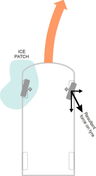 A negative offset achieves the same goal, with the added advantage that it improves stability under braking. First, let’s see what happens when the offset is positive. If one of the front wheels, the left-hand wheel say, loses grip on a slippery patch (or if the brake on that wheel fails) the imbalance in the resultant braking force tends to make the whole steering system swivel to the right. The resulting cornering force together with the unbalanced braking force on the right-hand front wheel tends to rotate the car bodily so that it veers to the right (figure 13). By contrast, with a negative offset, the wheels swivel in the opposite direction. The cornering force is reversed, and together with the unbalanced braking force, it produces a resultant force that passes roughly through the vehicle’s centre of mass. The resultant now exerts a relatively small torque about the centre of mass, and the car is more likely to remain on its original path (figure 14).