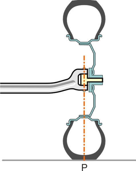 The angle of rake has increased over time. For many years, the upper limit was around 5\(^\circ{}\), but by the 1990’s, it grew to 8\(^\circ{}\) for rear-wheel drive cars [11]. The reason was nothing to do with stability. With a high castor angle, when the driver enters a curve the front wheel is presented to the road not vertically but leaning inwards like the front wheel of a motorcycle, which reduces the slip angle and makes the steering more precise. There is, however, a drawback: the greater the rake, the greater the mechanical trail, and the greater the self-aligning torque. Hence the driver must work harder to turn the handwheel when steering round a curve – the steering becomes ‘heavy’. The solution is to shift the stub axle slightly ahead of the pivot axis. In this way, the designer can raise the angle to more than 10\(^\circ{}\) [10].