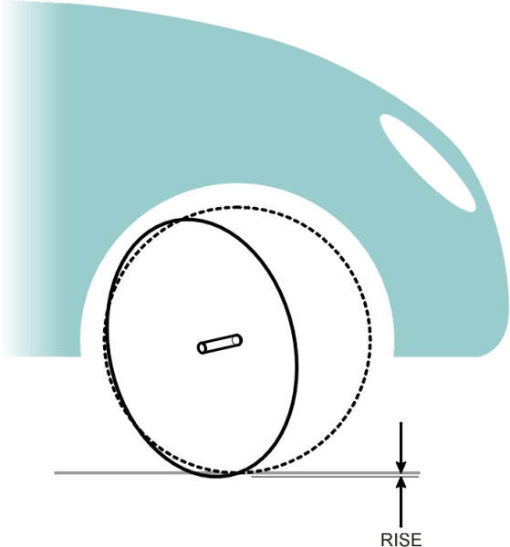 When viewed from the front of the vehicle, the pivot axis of a modern steering mechanism leans inward at an angle of up to 15\(^\circ\) [3], while the camber value is 1.5\(^\circ\) or less [4] [7]. In combination with castor angle, this explains why the front wheels of a parked car sometimes appear at an odd angle. Another consequence of pivot axis inclination is that each front axle stub pivots through an arc that is no longer lies within a plane parallel to the ground. When the driver turns the handwheel towards full lock, each wheel descends relative to the wheel arch (figure 11). In effect, the driver is jacking up the car [12].