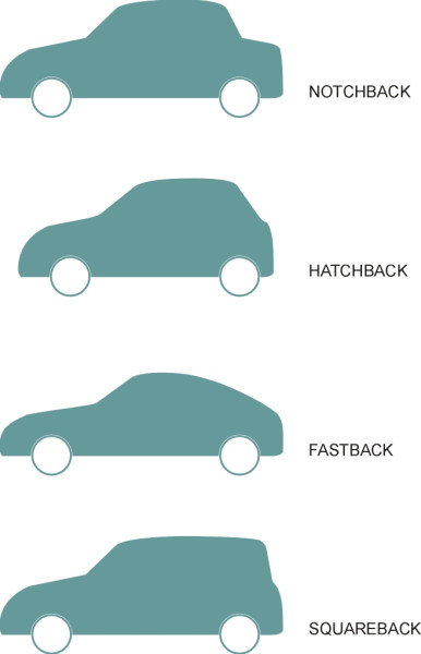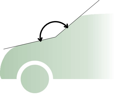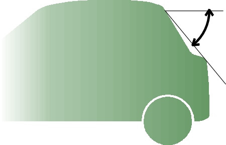 Over the years, designers have tailored different models of car to the needs of different types of customer. Among the alternative forms of rear-end treatment are the traditional ‘notchback’, the hatchback, and the fastback (figure 24). Surprisingly perhaps, the hatchback is among the least desirable of all possible shapes. The angle of the rear window or ‘backlight’ is critical, and it became a significant issue, for example, in the development of the Volkswagen Golf I [39]. Note that this angle is measured not along the slope of the glass itself, but as shown in figure 25, from the trailing edge of the roof to the trailing edge of the trunk (boot lid) [33]. The best results are achieved with a very shallow slope of 15\(^\circ\) to the horizontal (usually referred to as a ‘fastback’). The drag rises with increasing angle and peaks at around the typical hatchback angle of 30\(^\circ\) [36]. At this angle, the downwash keeps the air attached over the backlight but at the same time it encourages vortices from the rear corners and hence drag. As the angle increases further, the drag falls again, and in fact a squareback estate can have lower drag than a notchback based on the same body shape [14].