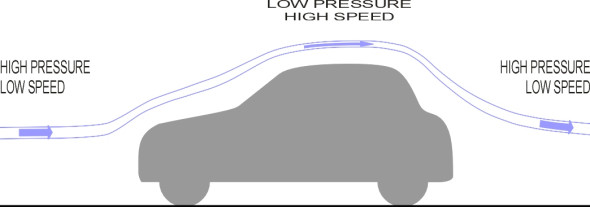 If you think of a car as a rounded hemisphere skating along the road surface like a beetle, it seems obvious that the air must rise like an arch over the roof and fall again in its wake. When the streamlines are squeezed together at the highest point of the arch, the pressure is appreciably reduced, and produces lift just like the wing of an aircraft although the motion of the air is messier and geometrically more complicated. To find the overall lift force we could in principle divide the body surface into small elements and work out the magnitude and direction of the normal force acting on each element, then sum the components that act at right-angles to the direction of motion.